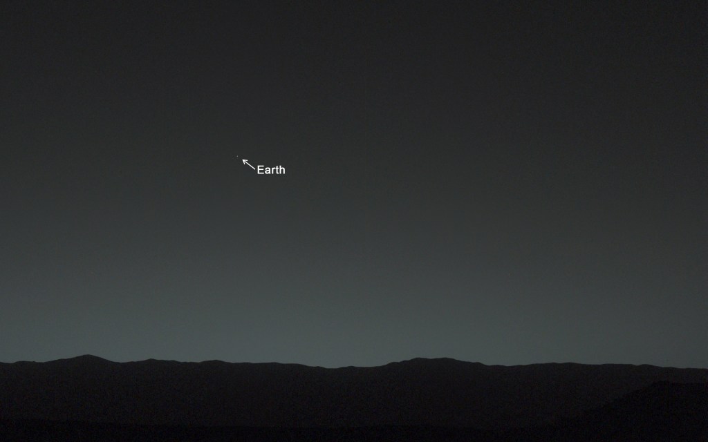 Top photo: This view of the twilight sky and Martian horizon taken by NASA’s Curiosity Mars rover includes Earth as the brightest point of light in the night sky. Earth is a little left of centre in the image, and our moon is just below Earth.